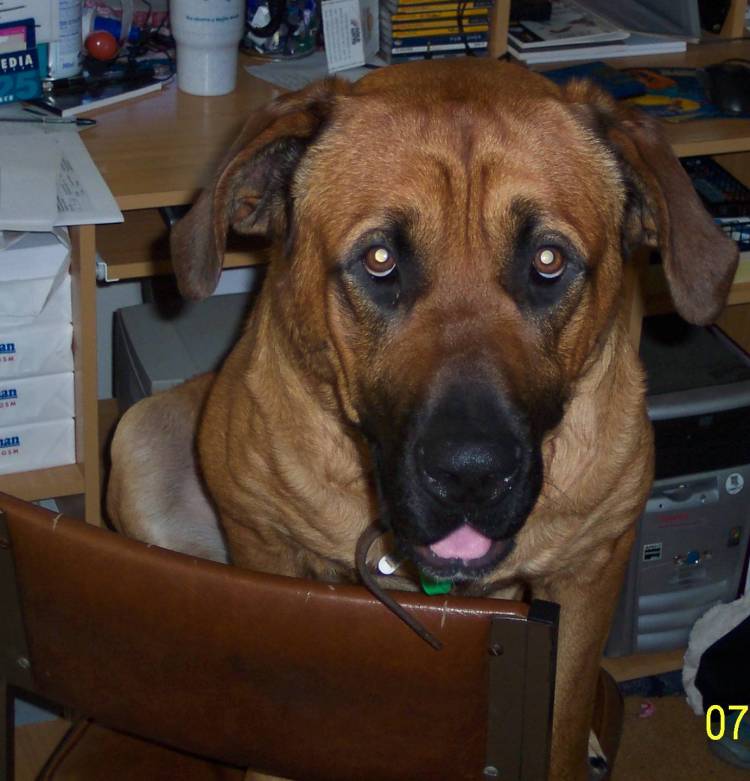 He's a mutt but seems to have alot of boxer in him. He never leaves my side when I'm home. If I sit he'll be right beside my chair. If I'm moving around the house cleaning, he's never more then 2 steps away. (which at times has caused him to be tripped over) He's not allowed up stairs, so when I go up to bed at night he sleeps at the bottom of the stairs and each morning when I go down stairs I'm greeted first by his wagging tail thumping on the floor , then he prances and jumps all over like I'd been gone for a month.