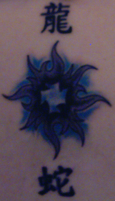 heres mine its on my upper back starting at the nape of my neck,its about 7-8 inches from the top to the bottom of the design, the top chinese symbol is of the zodiac symbol for the dragon and the bottome one is the symbol for the snake which represent my daughter(dragon) and myself the snake, the middle symbol was one the tattoo guy and I created together based on a drawing I had.