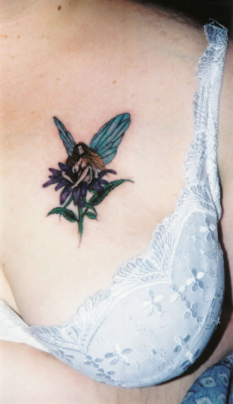 My fly..........still a little red and the cream dried over it in a glaze as it was only 4 or so days old here! Scuse the bra pic....it was the better of all the tat pics I have.