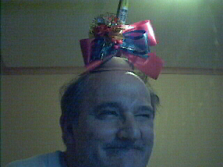 A guy with a Xmas plunger on his head.